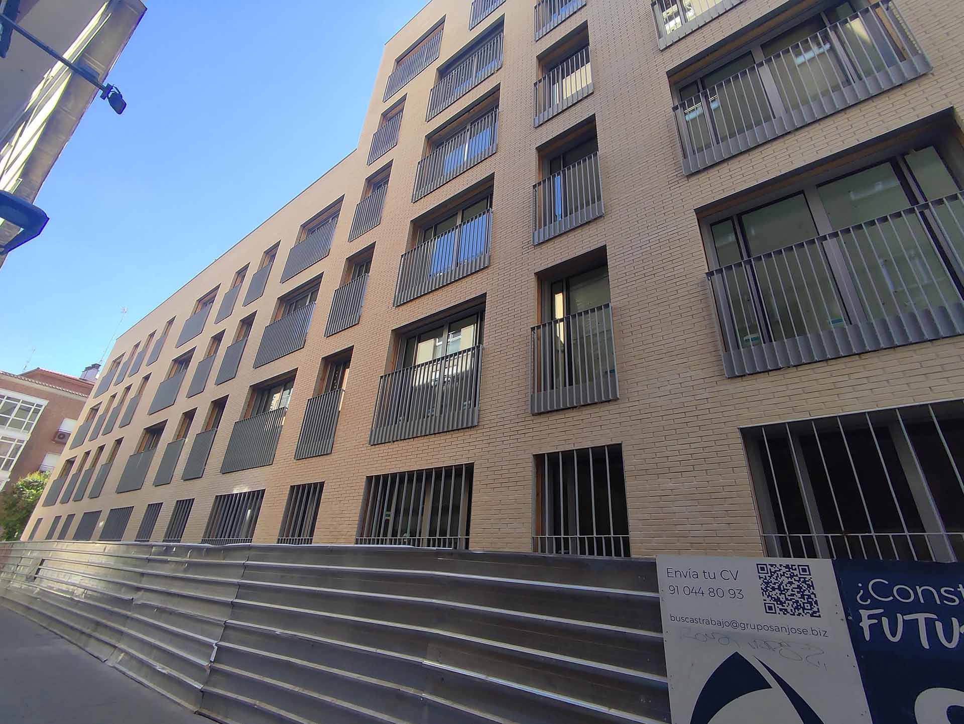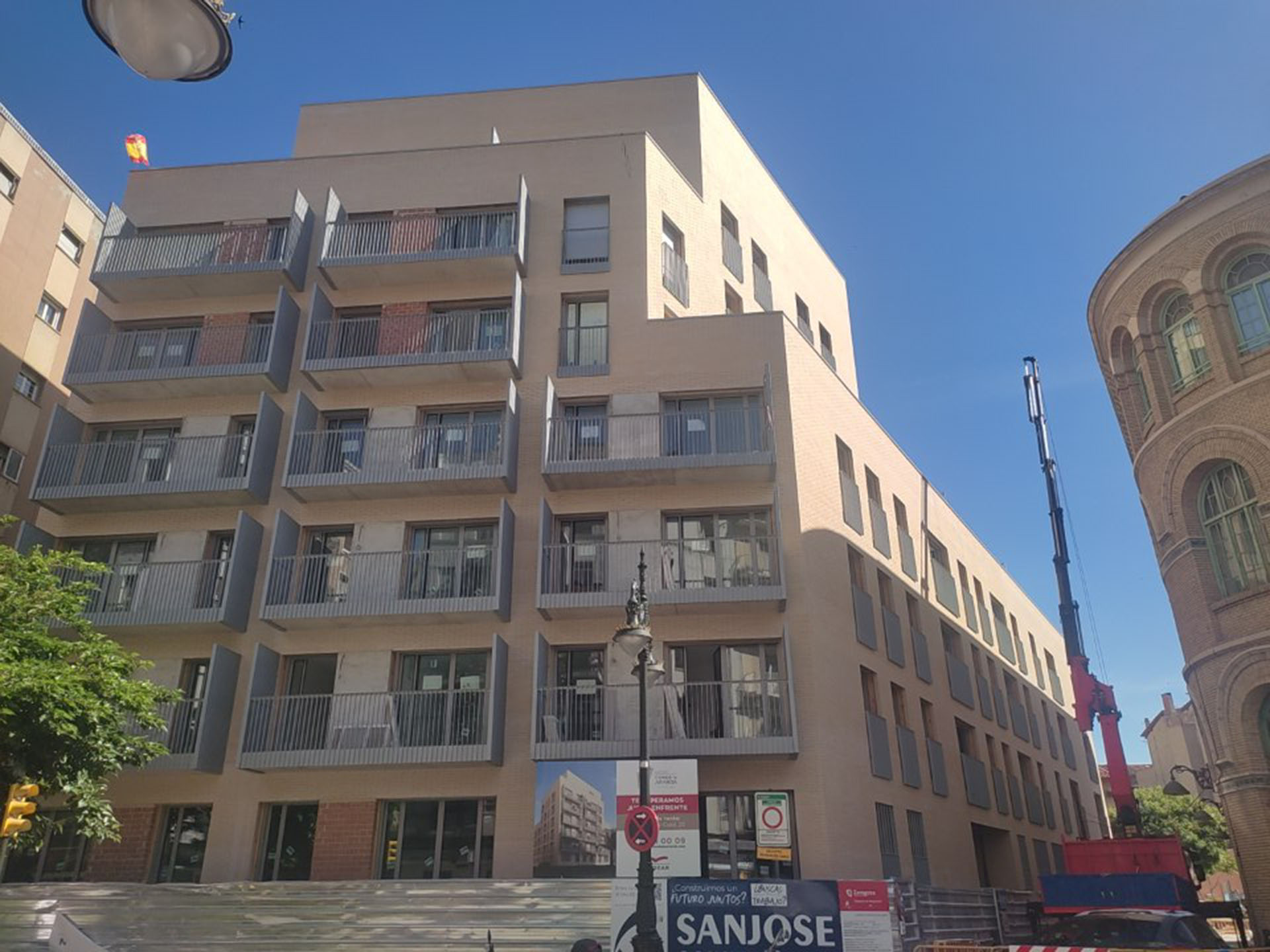 La fachada del edificio se encuentra completamente finalizada y la grúa ha sido desmontada, al igual que el andamiaje del patio interior. Las instalaciones en ambas escaleras están terminadas.