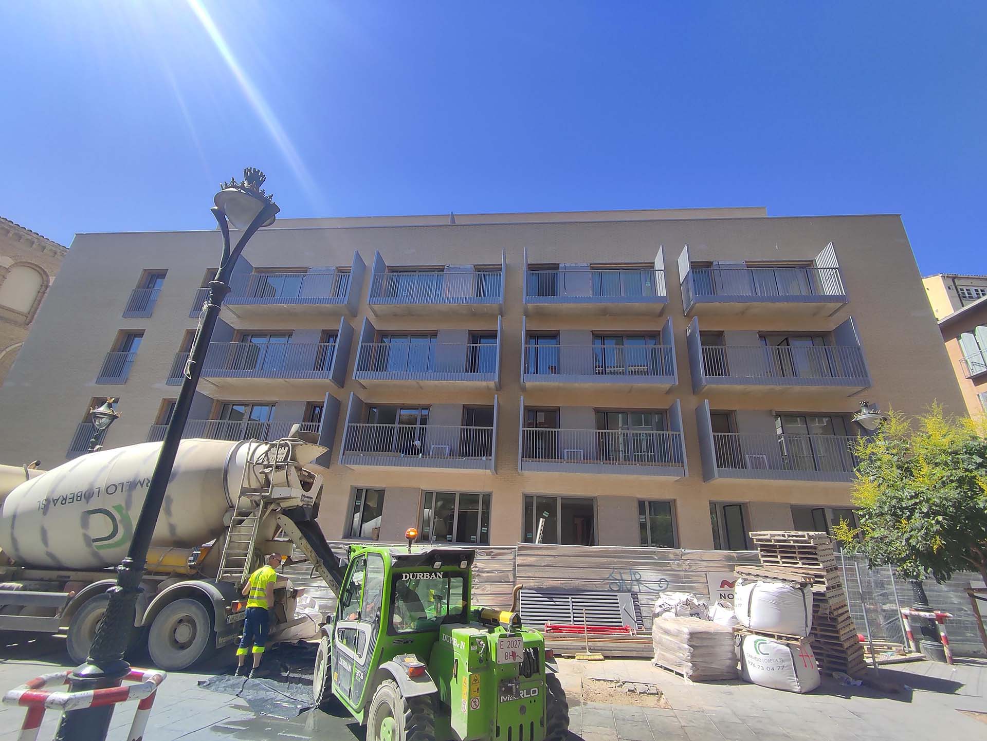 Se han completado los solados de cubiertas y terrazas en todos los niveles, así como la cerrajería y la instalación del vidrio en la carpintería exterior. También han finalizado los trabajos de alicatado y solado en el interior de las viviendas.