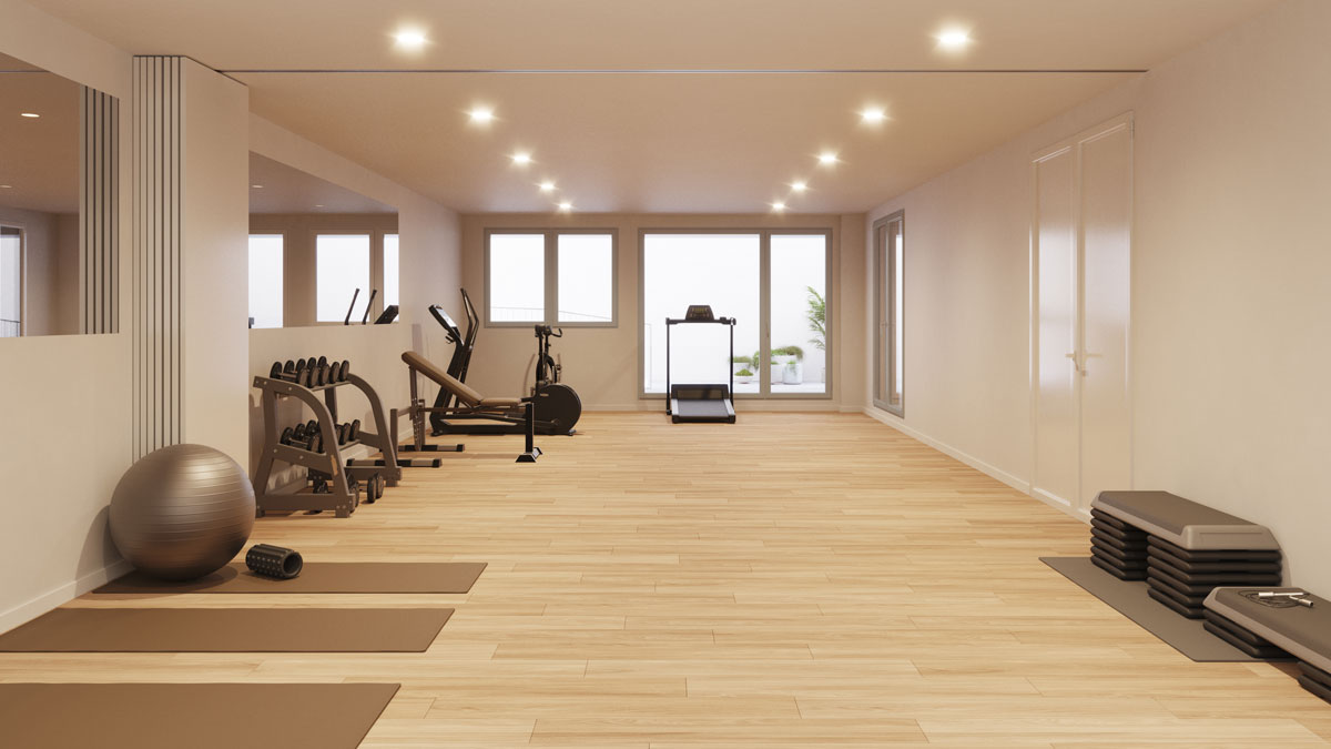 La singularidad de la edificación se pone de relieve, además, por los espacios comunitarios. Un gimnasio amplio, con sala de baile, donde ponerse en forma y desarrollar actividades saludables y una sala coliving, muy versátil, con cocina y zona de estar, para llenar de vida con familiares y amigos.