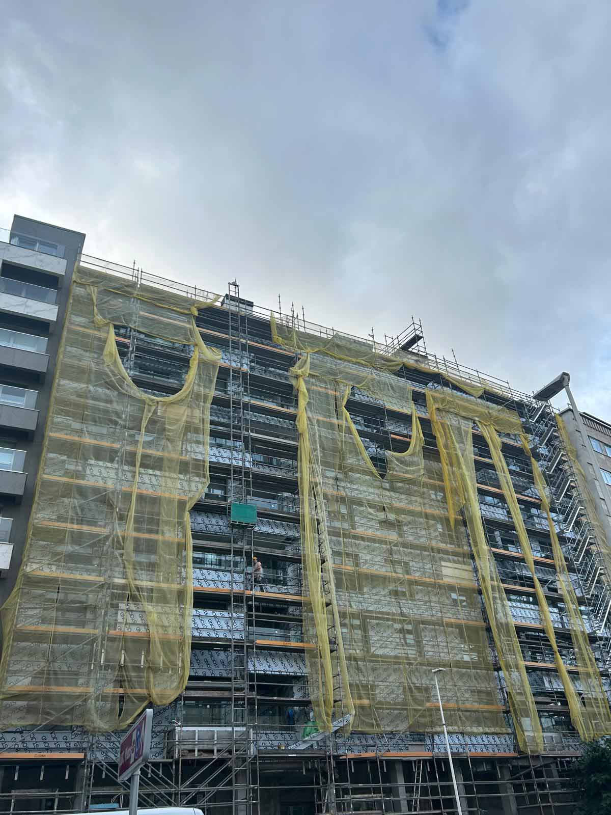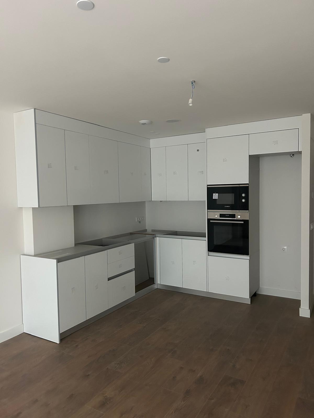 Ha comenzado el montaje de las cocinas en el interior de las viviendas, mientras que en el exterior avanzan los trabajos de acabado de fachada, con la instalación del sistema SATE en la fachada interior y la colocación del revestimiento de composite en la fachada exterior.