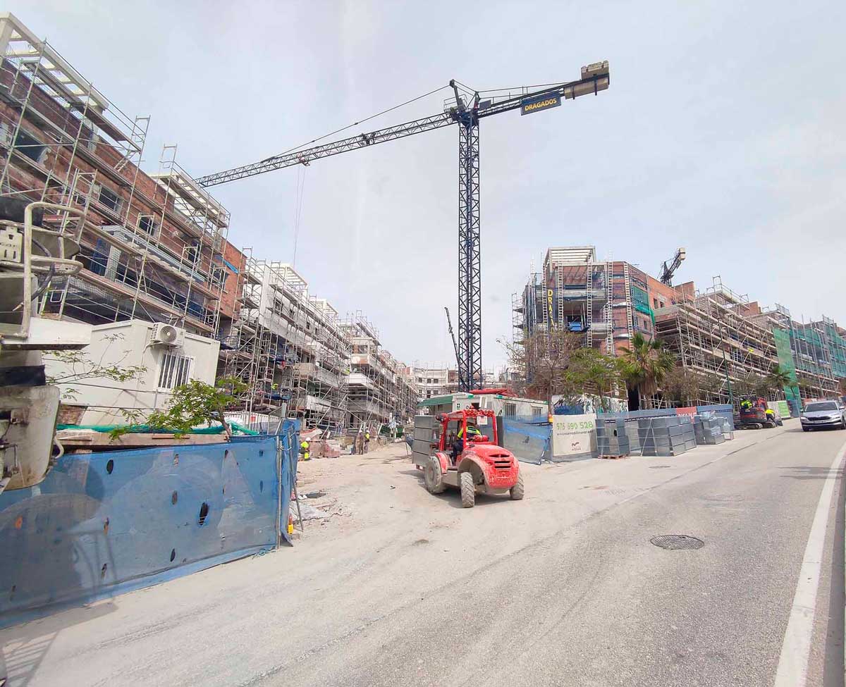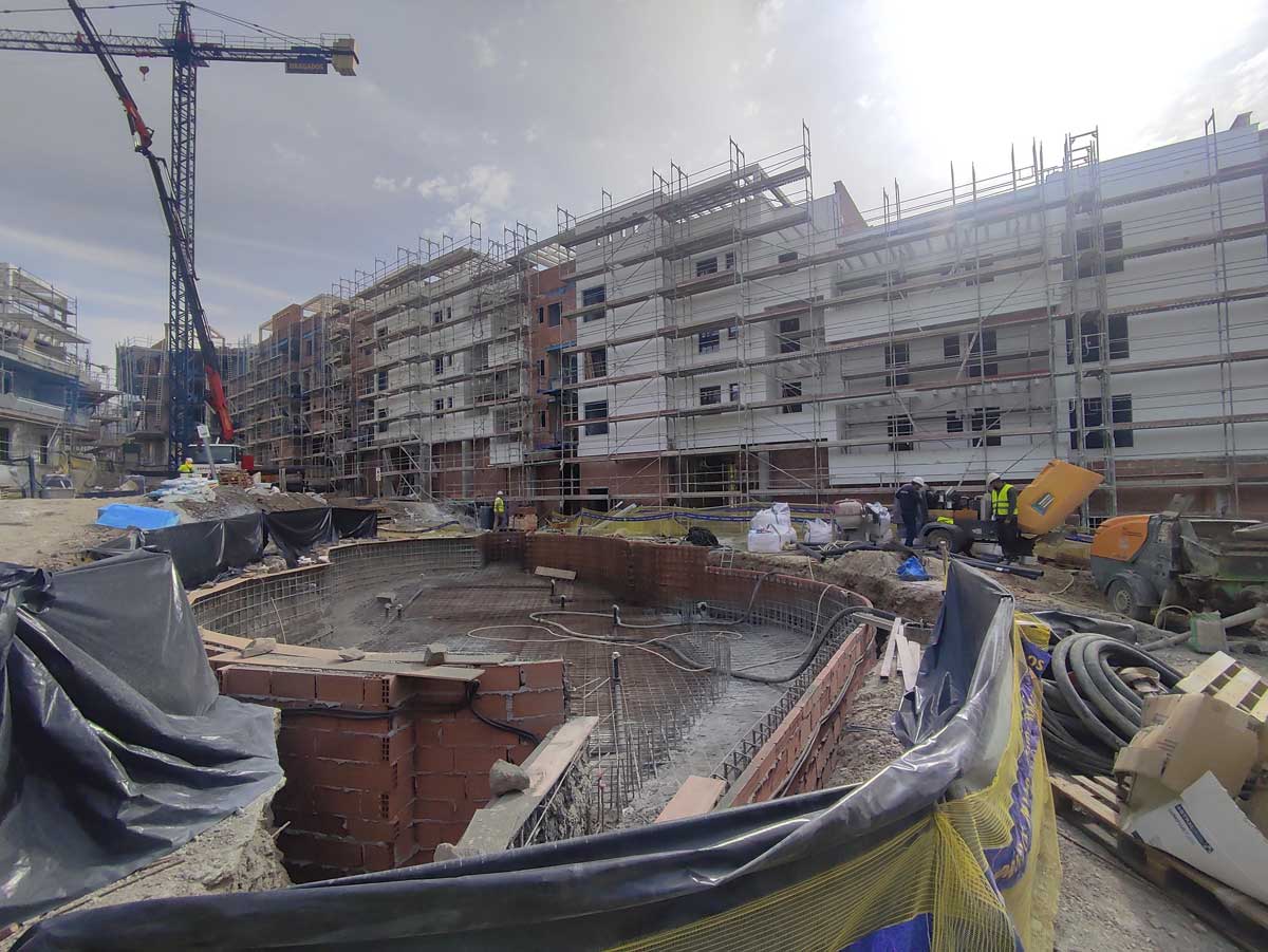 La obra se encuentra con la albañilería exterior terminada y se está finalizando la tabiquería interior, al igual que la ejecución de instalaciones. Se han concluido revestimientos en 10 portales por el interior a la urbanización y en 8 por el exterior.