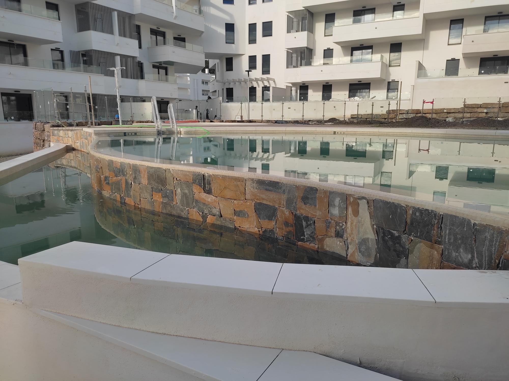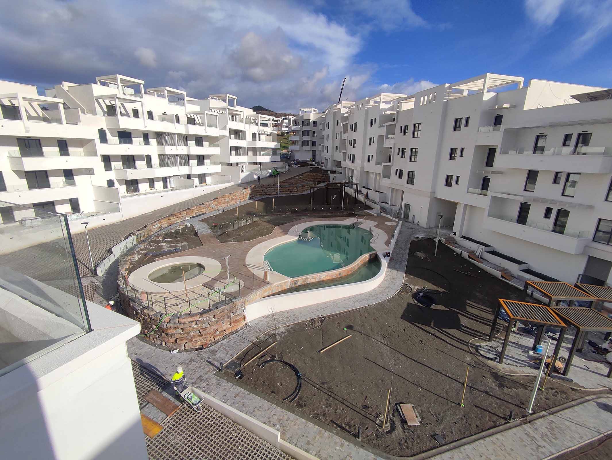 La obra cuenta con las fachadas terminadas, encontrándose actualmente en fase de repasos de las mismas. De forma paralela, se están ejecutando los repasos interiores de las viviendas y se están finalizando las zonas comunes de los portales.