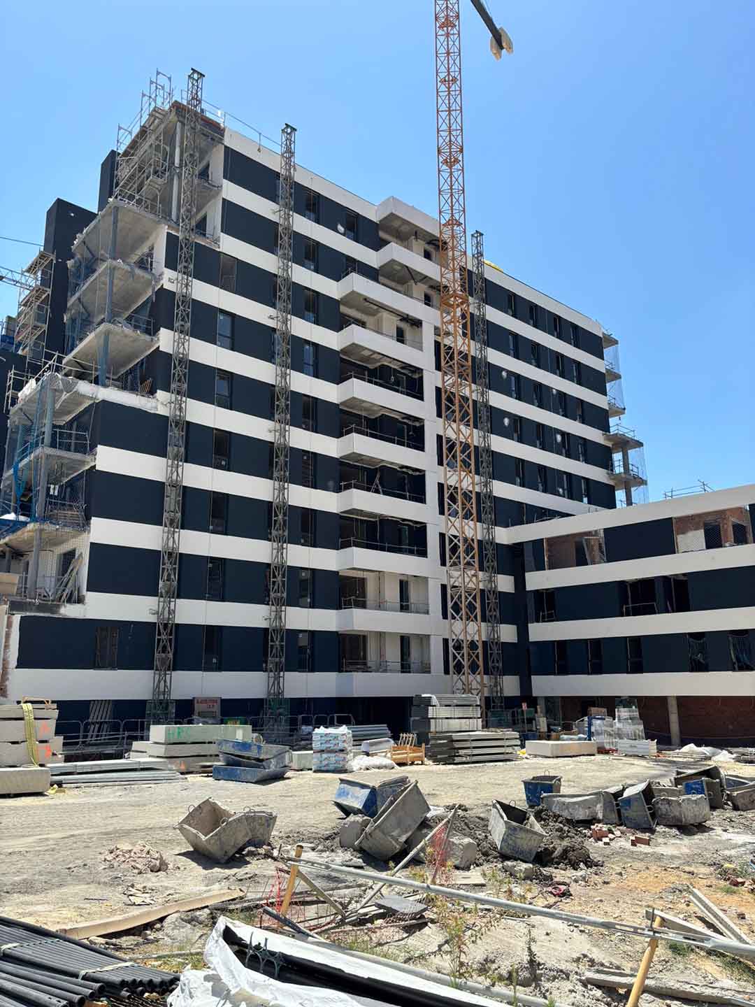 En cuanto al aislamiento y trasdosados, se progresa en el bloque 1, estando concluidos los trabajos en los bloques 2 y 3. Se continúa con el montaje de la carpintería metálica en los bloques 2 y 3, avanzando también en el bloque 1.
