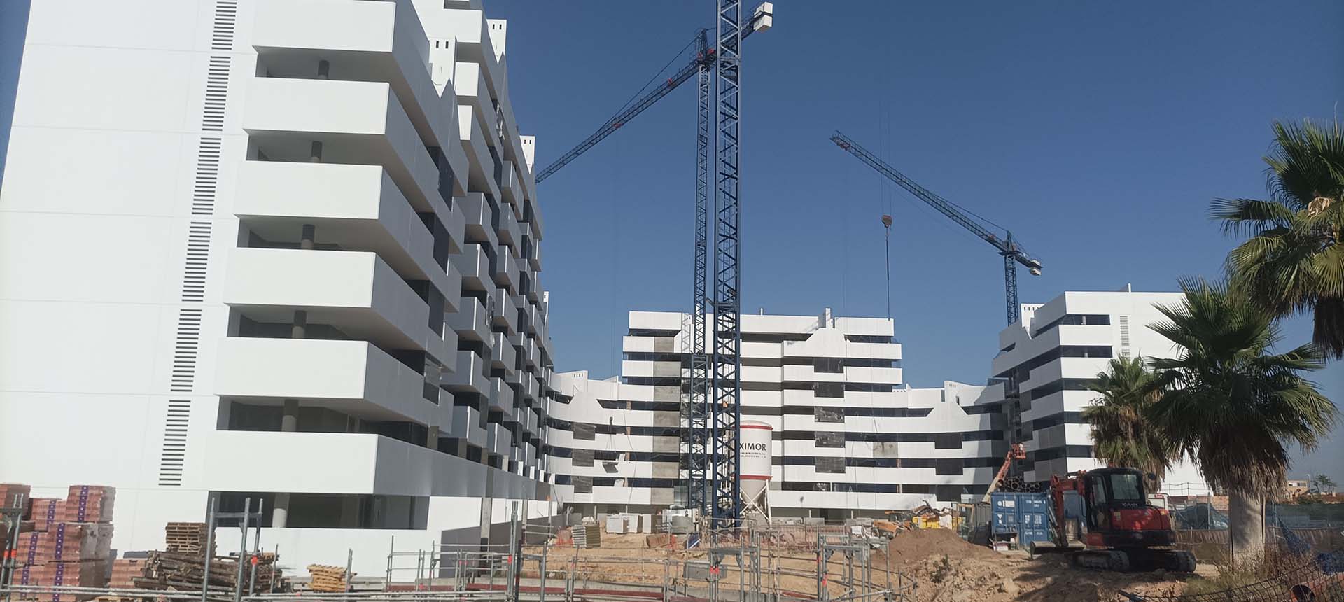 En el interior de las viviendas, avanza la colocación del suelo laminado y la carpintería de madera en los bloques 5 y 6, estando ya finalizados los bloques 7, 8 y 9. También se progresa en la colocación de los solados y alicatados de cocinas y baños en el bloque 5, mientras que los bloques 6, 7, 8 y 9 ya están terminados.