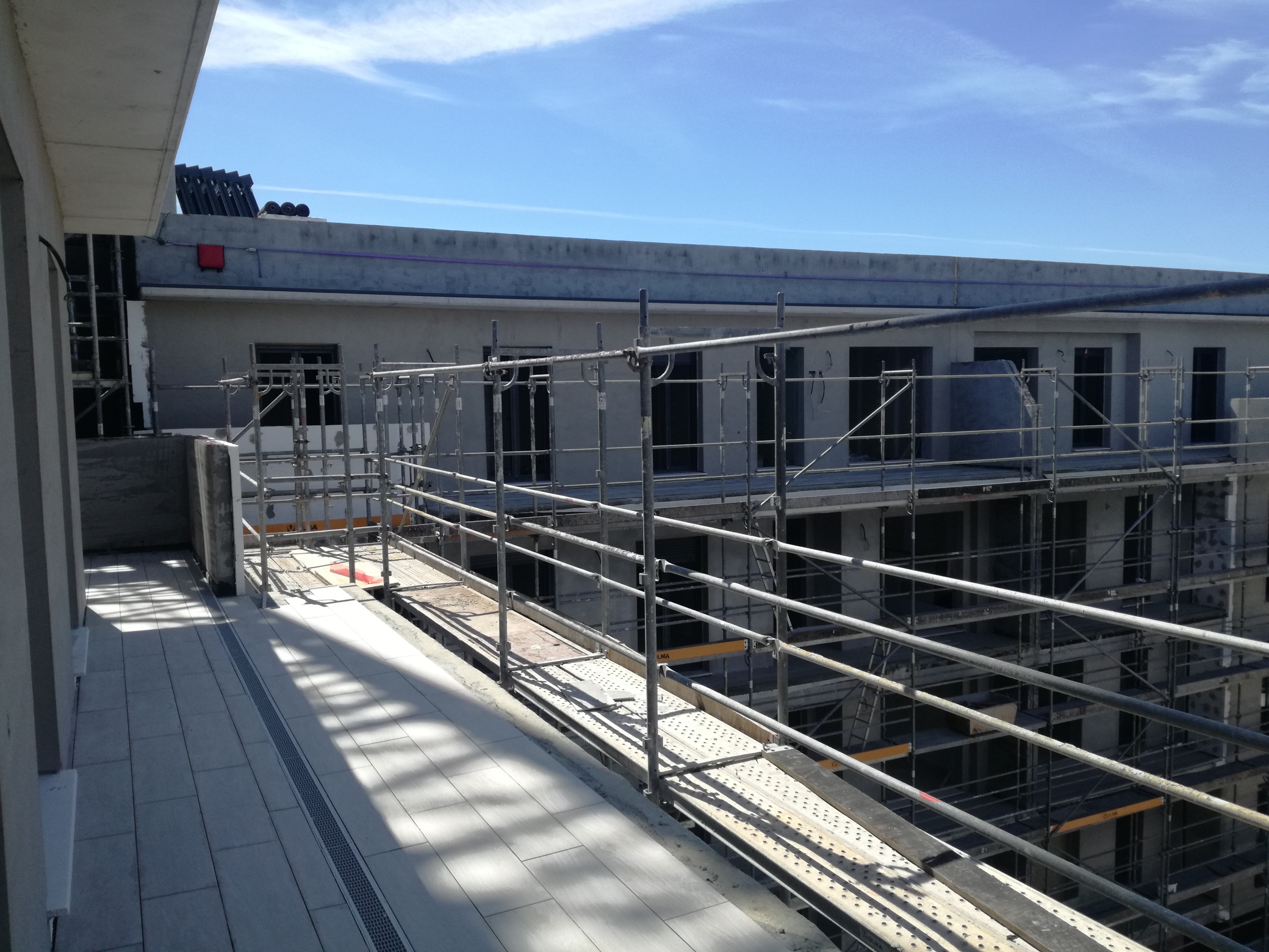 Por otro lado, los falsos techos se encuentran por planta 3ª y se ha comenzado a alicatar y solar las viviendas, ya que las instalaciones están muy avanzadas en general.