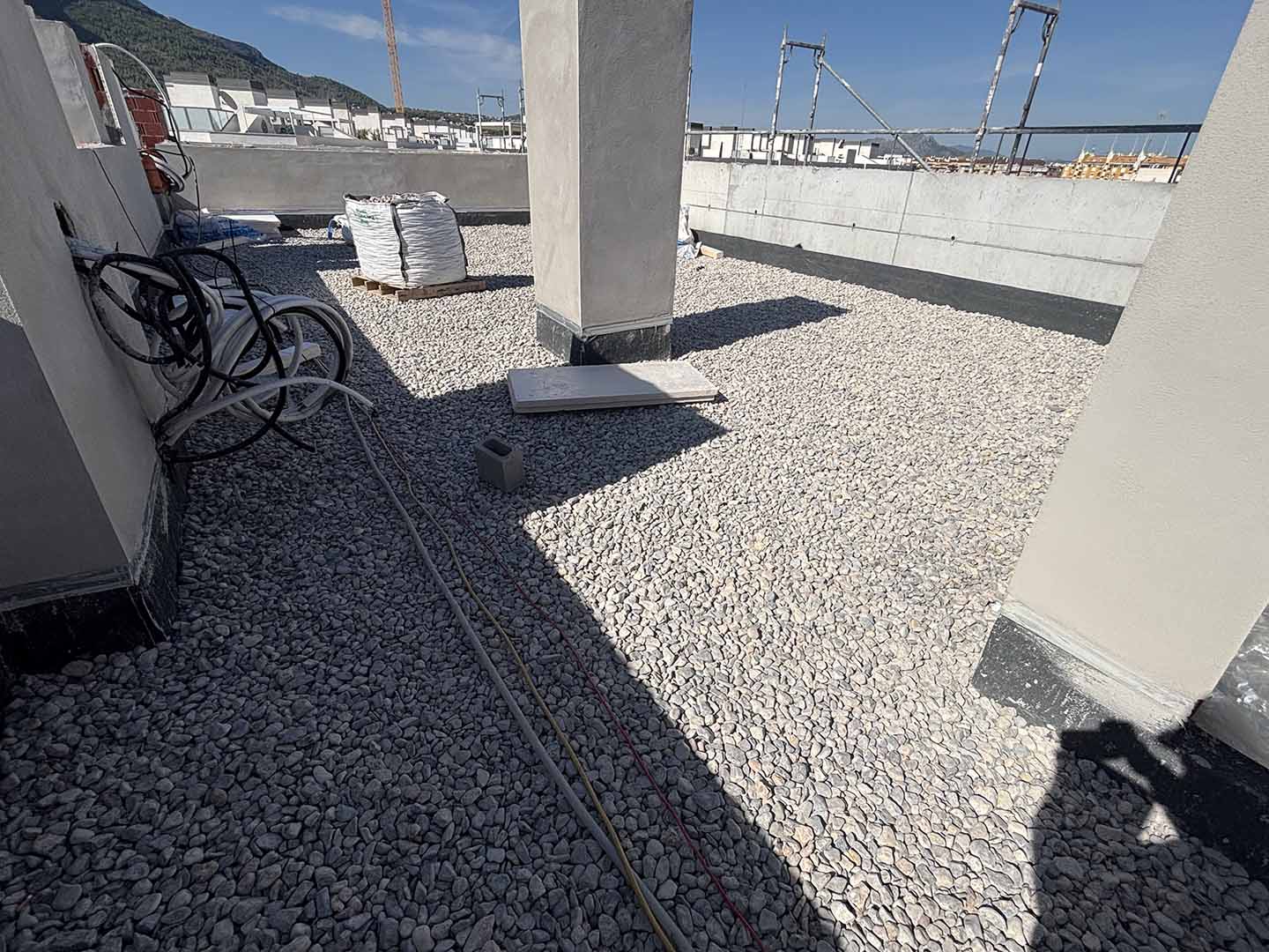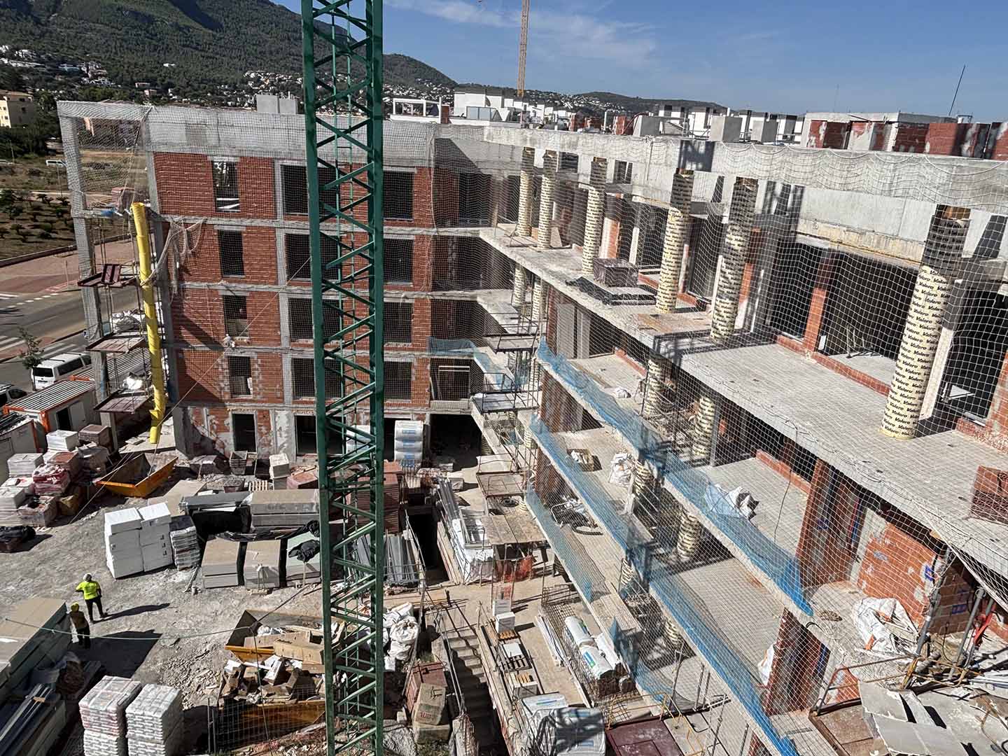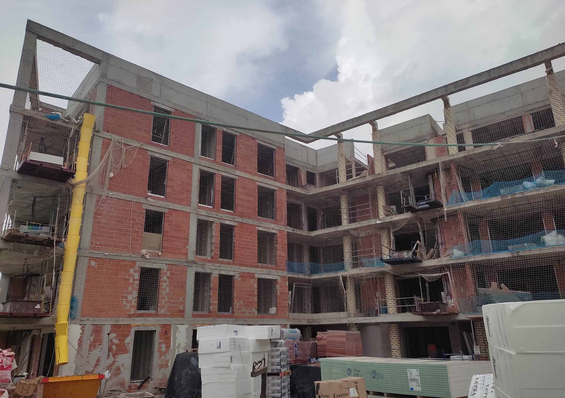 Continúan los trabajos de albañilería y recrecidos, así como las labores correspondientes a las instalaciones eléctricas, fontanería, saneamiento, ventilación y climatización. Del mismo modo, prosiguen los trabajos de tabiquería seca y de impermeabilización de cubiertas. En paralelo, se han iniciado ya los trabajos de SATE.