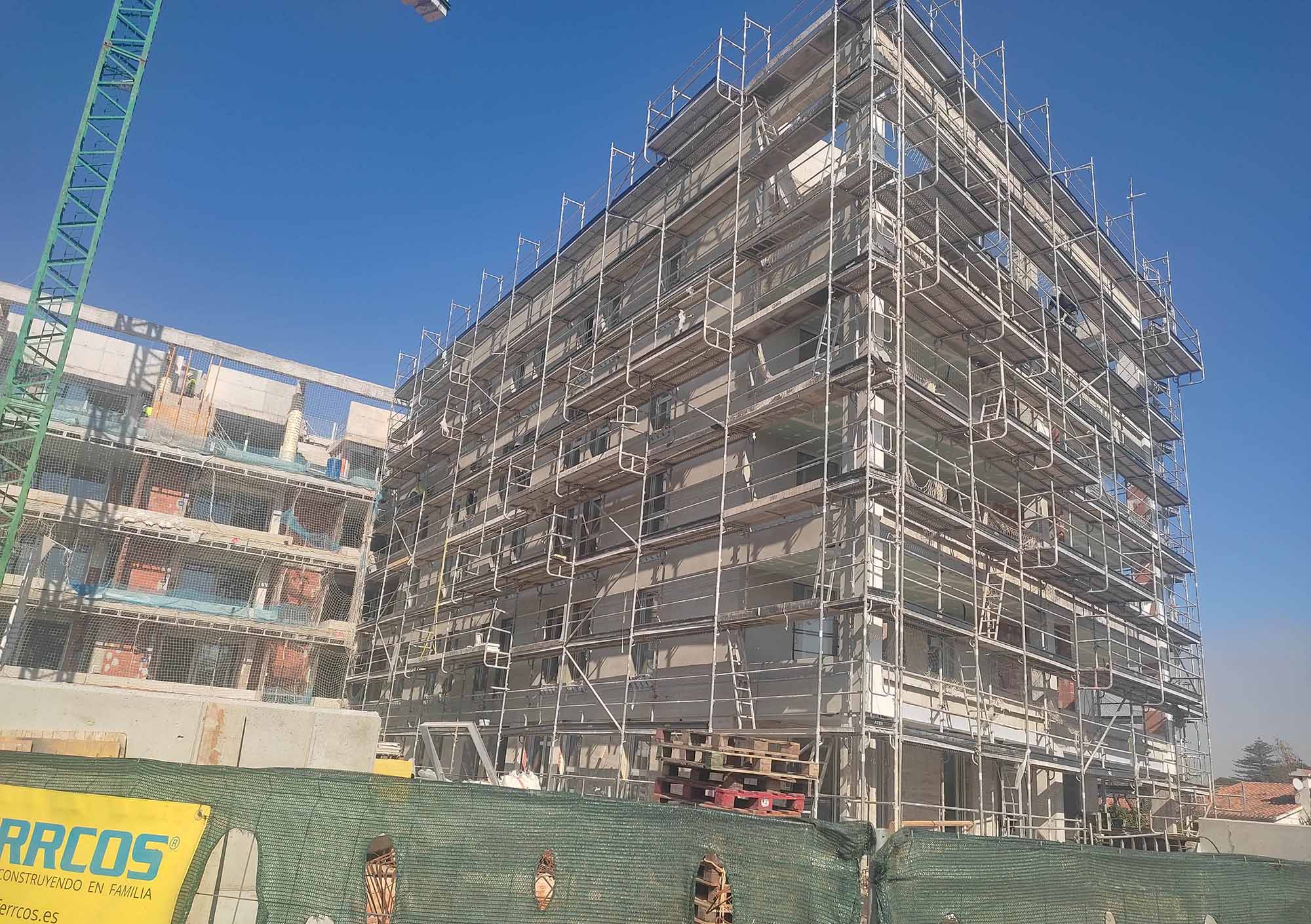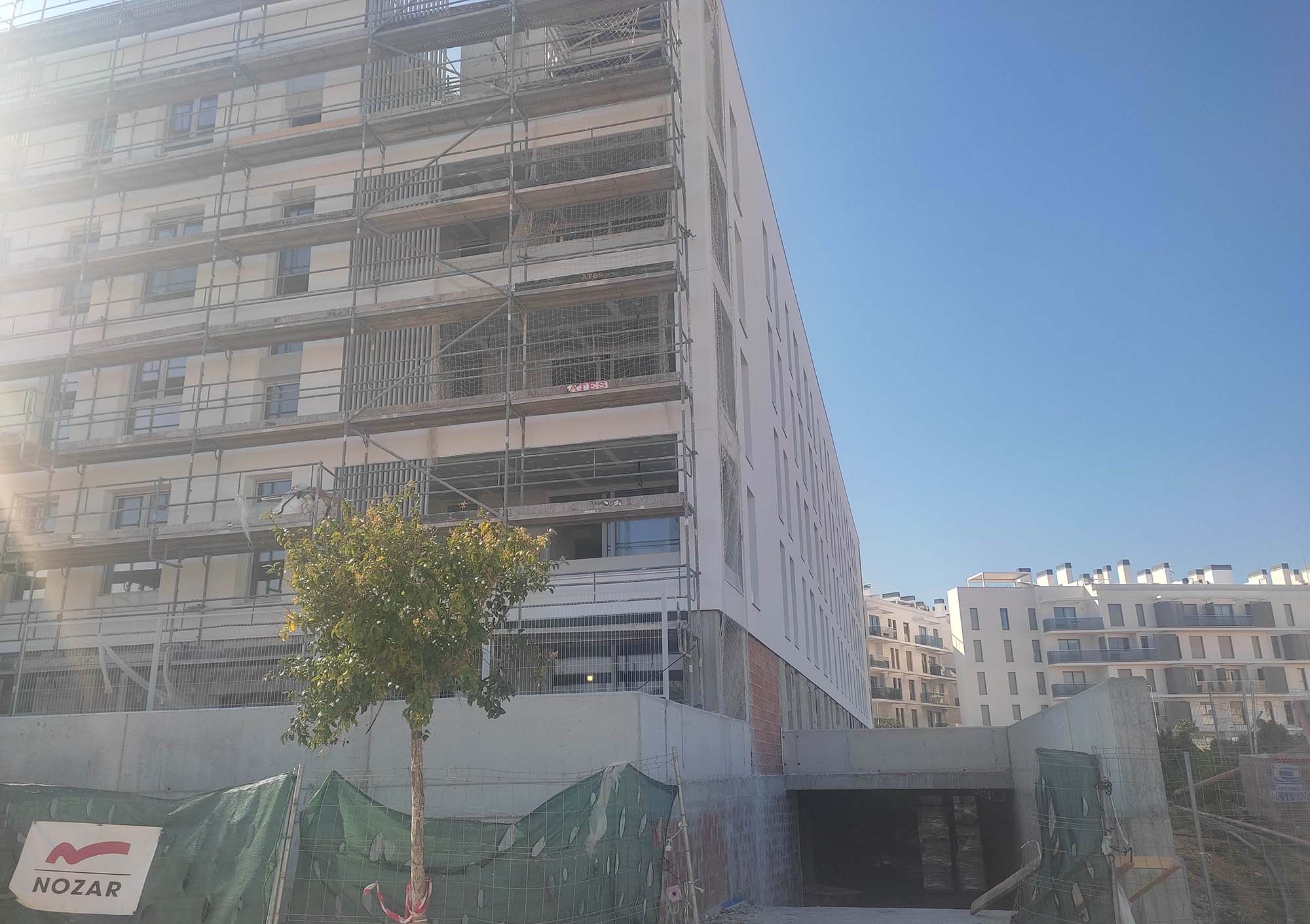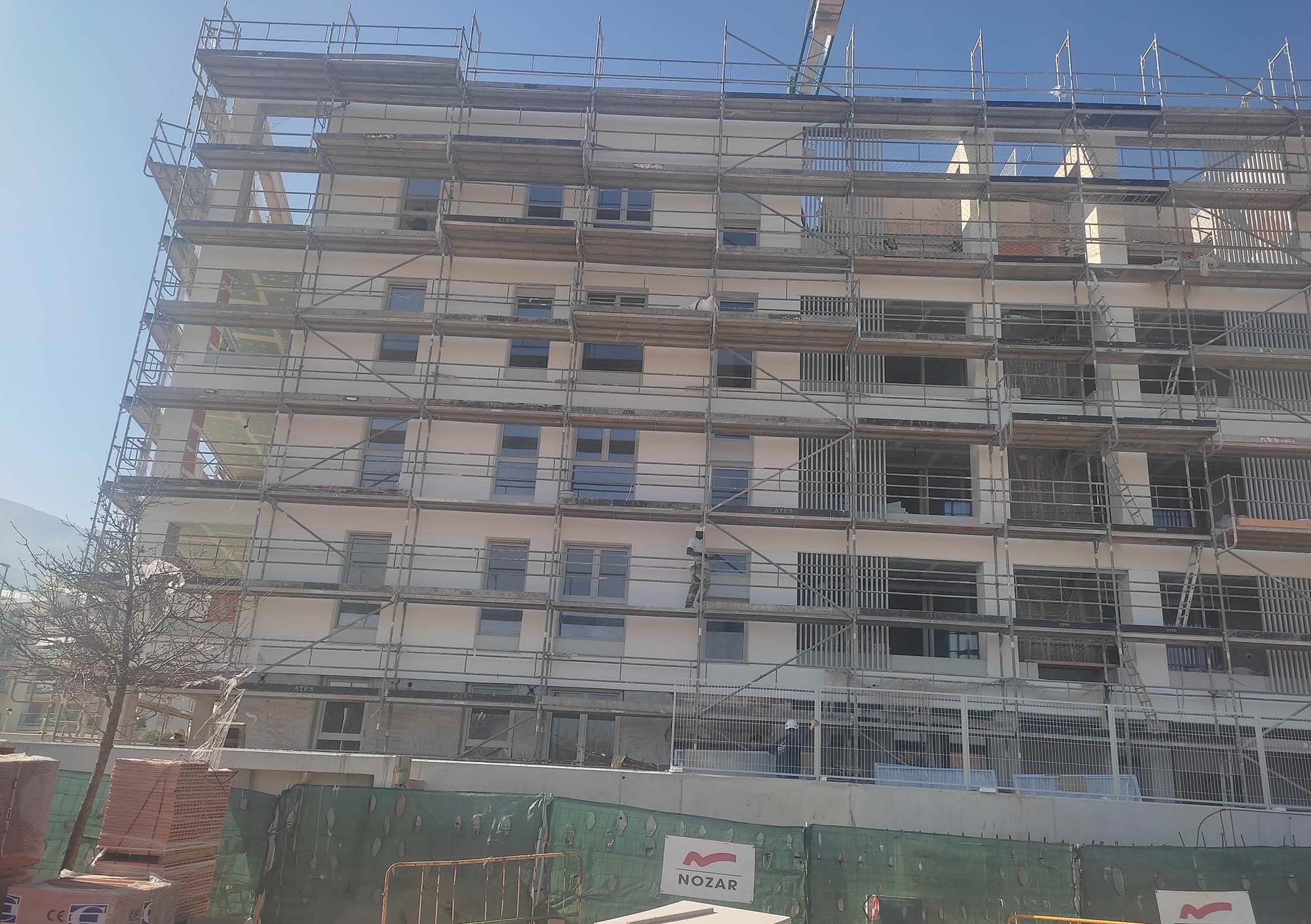 Se han finalizado los trabajos de impermeabilización en cubiertas y terrazas de las viviendas. Por otra parte, siguen en ejecución los trabajos de SATE en fachadas, la urbanización exterior, la piscina, el montaje de mobiliario de cocinas y los trabajos de pintura.