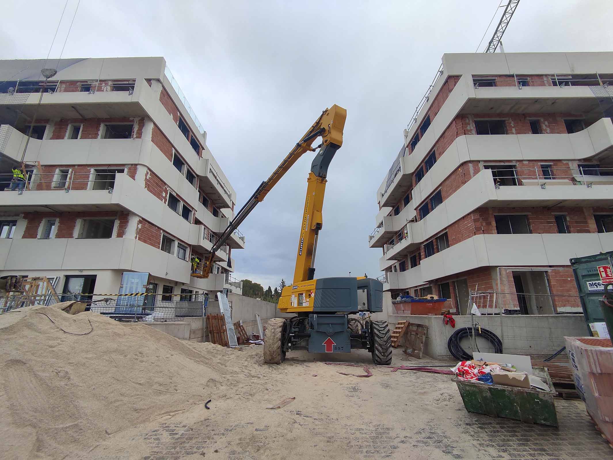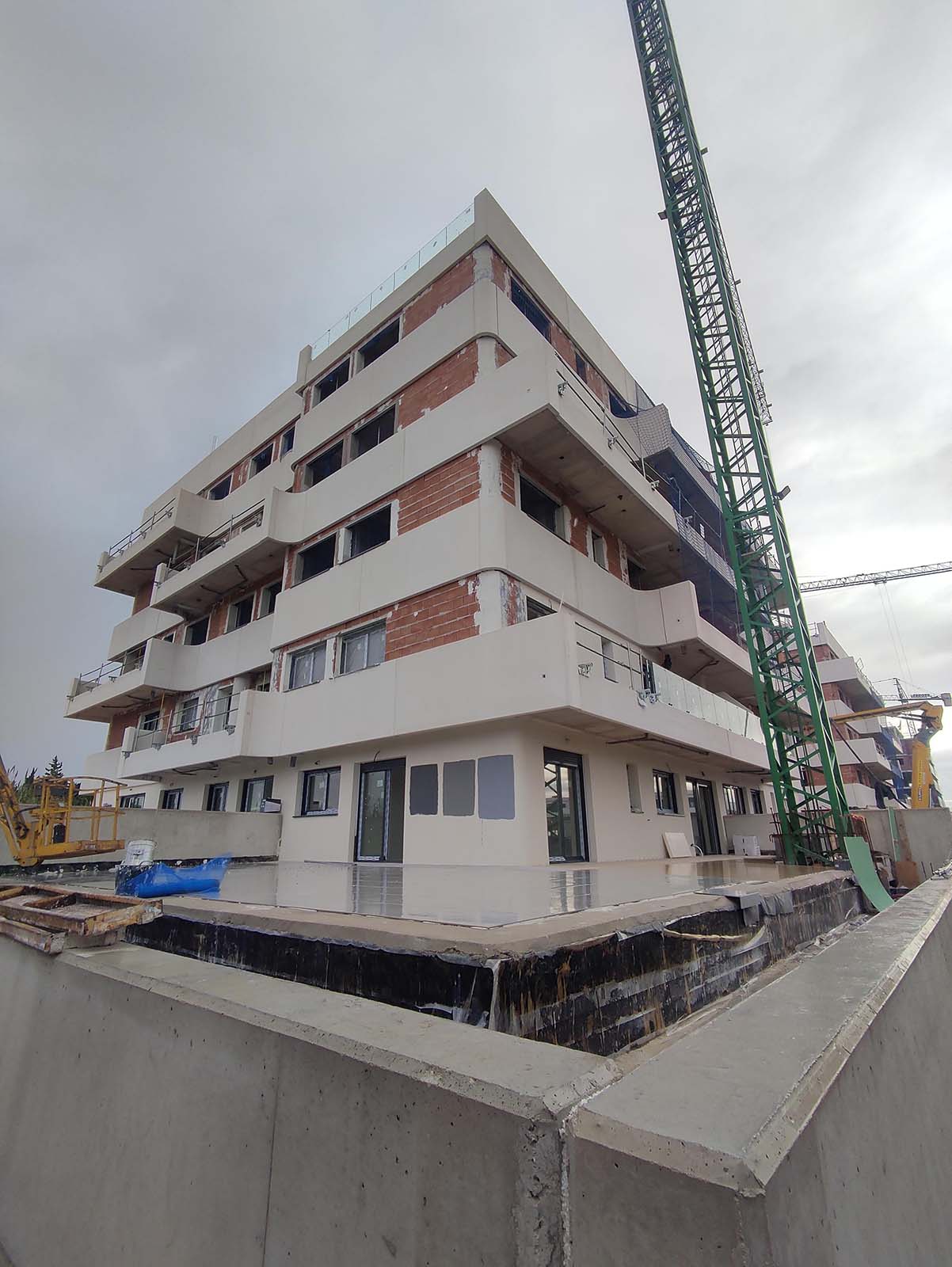 Por otro lado, se ha completado la colocación de los elementos prefabricados en las fachadas de ambos bloques, se están terminando los solados de las terrazas y se están ejecutando los falsos techos en el bloque 1.
