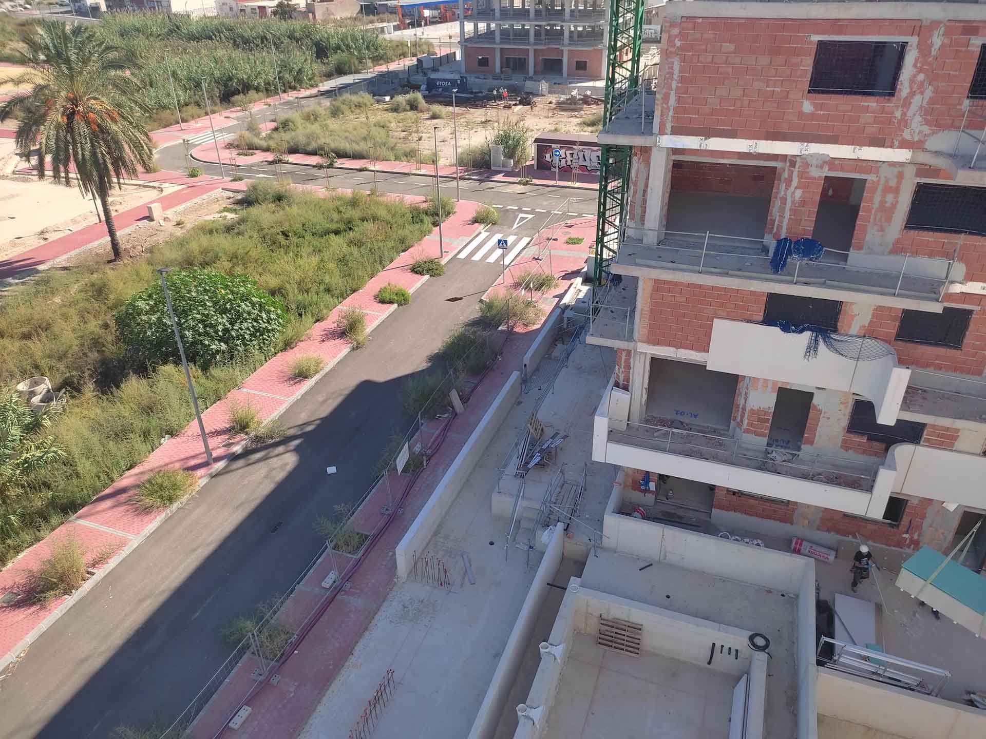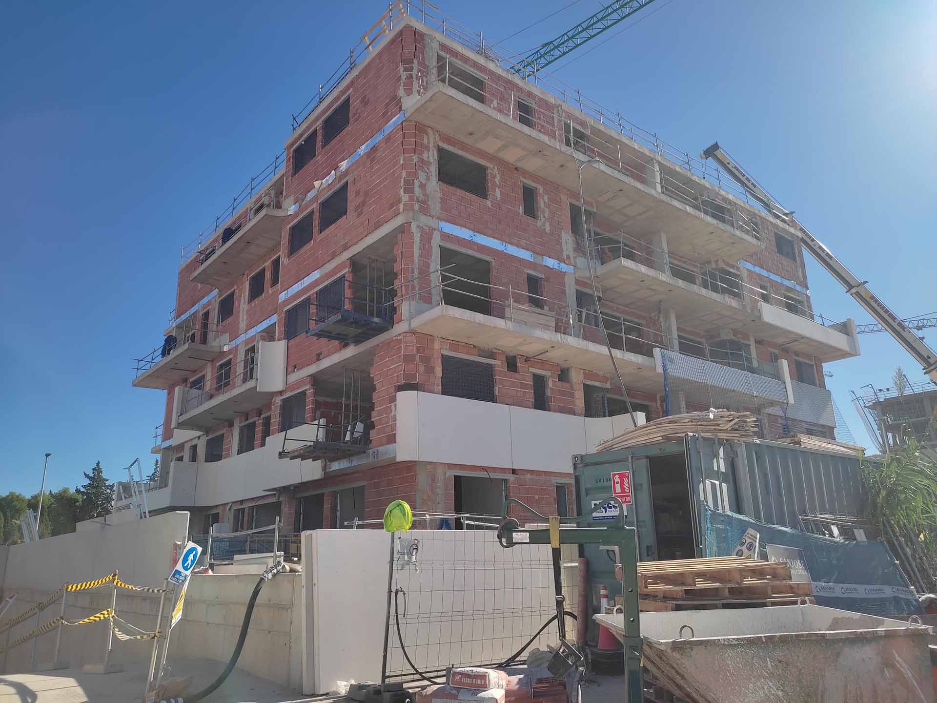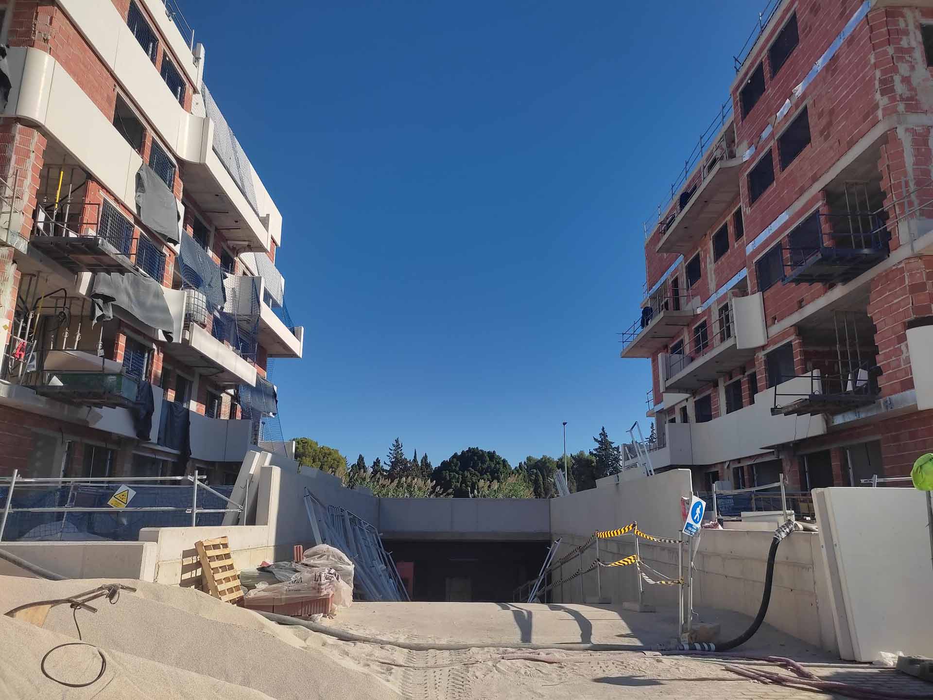 La obra se encuentra en fase de albañilería. El bloque 1 tiene finalizada la fábrica de fachada, mientras que en el bloque 2 se están completando los trabajos.