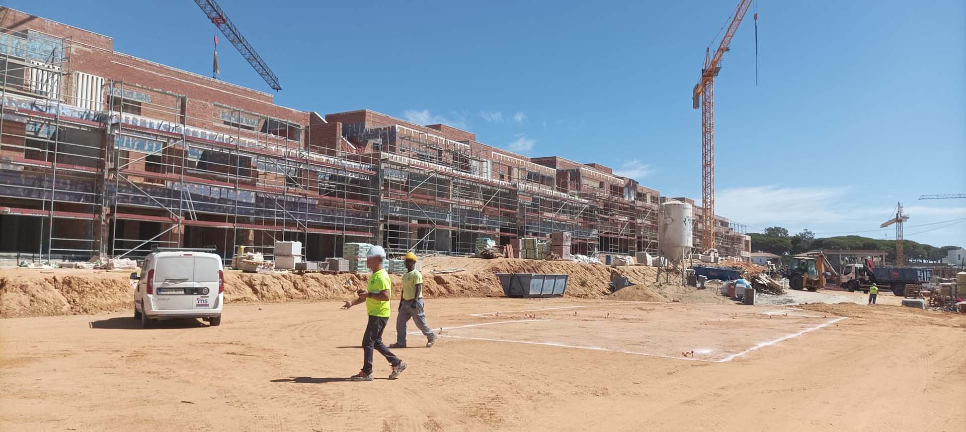 Se progresa en la instalación de carpintería exterior y cerrajería, alcanzando ya casi dos portales completos. En paralelo, se desarrolla la urbanización, actualmente en fase inicial.