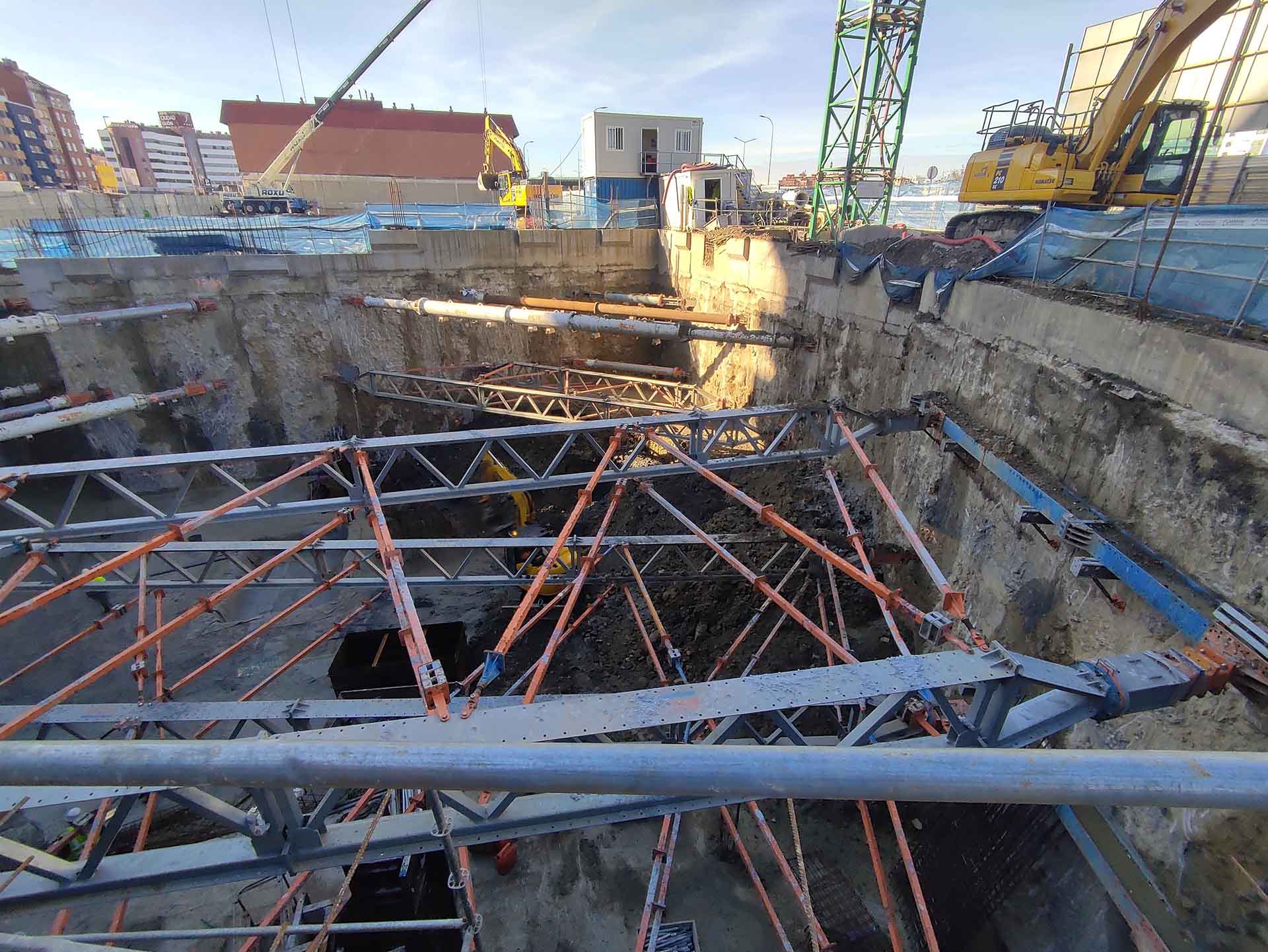 La obra cuenta con la contención completamente finalizada. Actualmente, se está retirando el arriostramiento entre pantallas de forma gradual, conforme avanza la ejecución de los forjados por plantas, alcanzando aproximadamente el 50% de la parcela hasta cota cero.
